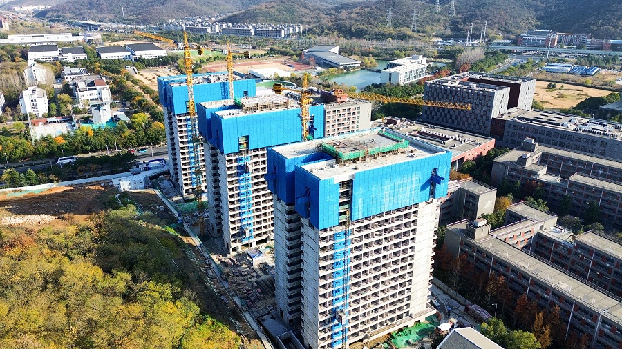 該項目總建筑面積約7.14萬平方米,主要新建3棟地上19層、地下1層的現代化宿舍樓及配套設施。建設期間,項目團隊始終將“安全達標、文明有序、綠色低碳”理念貫穿全過程,多措并舉夯實安全管理基礎:嚴格執行三級安全教育全覆蓋、健康檔案“一人一檔”、特種作業人員持證上崗等措施,筑牢人員安全基礎;定期組織應急演練與安全巡查,不斷提升風險防控和隱患排查治理能力;全面貫徹南京市“十達標”“兩承諾”“一公示”管理要求,配備霧炮機、噴淋系統等環保設施,實現施工道路全硬化、裸露土方綠網全覆蓋;現場材料清晰分類、圍擋整潔美觀、安全標牌醒目,生活區實行標準化管理,衛生防疫與消防要求雙達標,營造了文明、整潔、安全的生產與生活環境。
